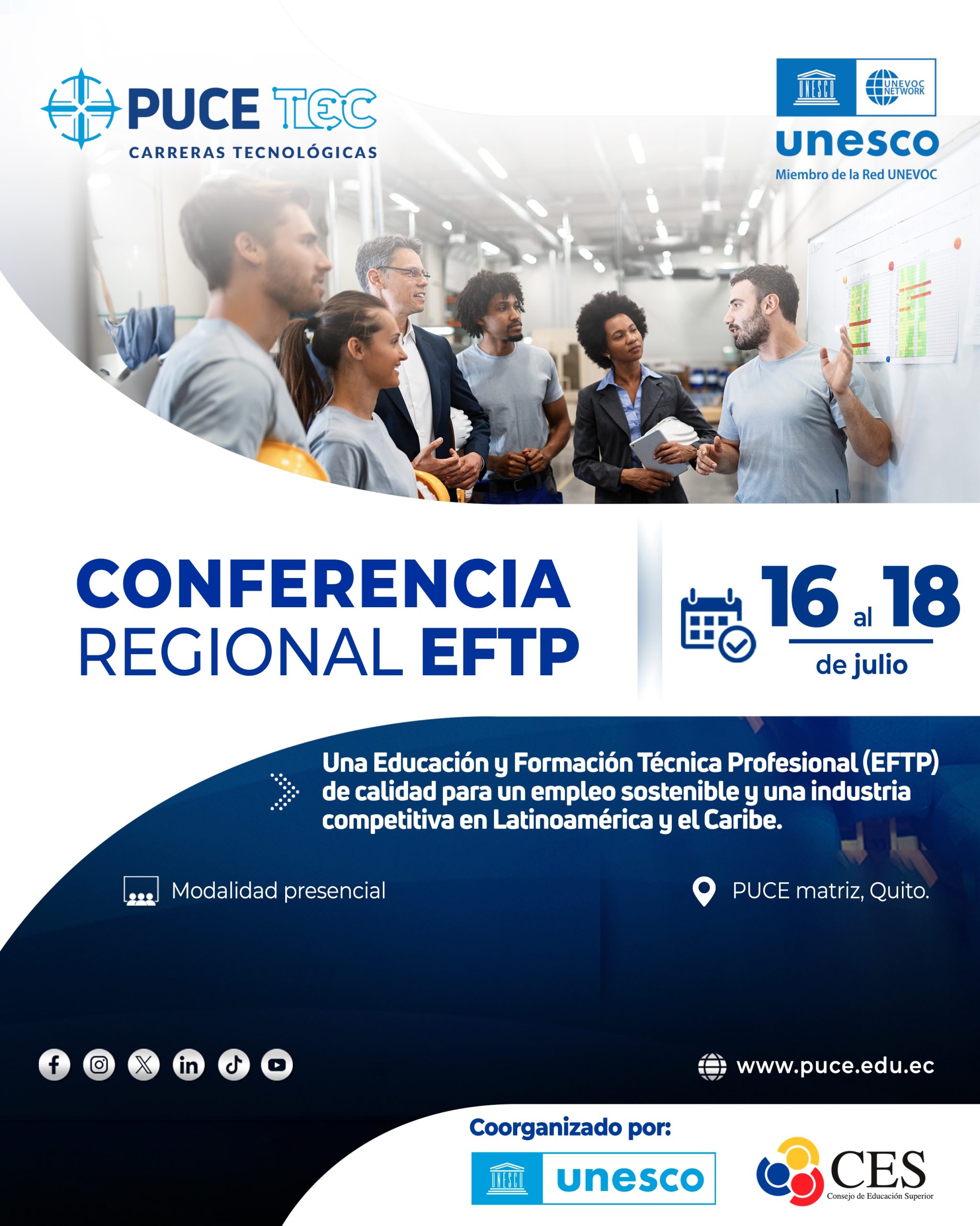 Este evento, organizado por el Centro UNEVOC de la PUCE, a cargo de la Unidad Especializada de Formación Técnico-Tecnológica (PUCE TEC), el Centro Internacional UNESCO-UNEVOC para la Educación y Formación Técnica y Profesional ubicado en Alemania, la Organización de las Naciones Unidas para la Educación, la Ciencia y la Cultura (UNESCO) y el Consejo de Educación Superior (CES) reunirá a el ecosistema de la EFTP, a nivel nacional, regional e internacional con el objetivo de abrir un espacio de colaboración público-privada y el desarrollo de un proceso regional que responda a las demandas productivas futuras.