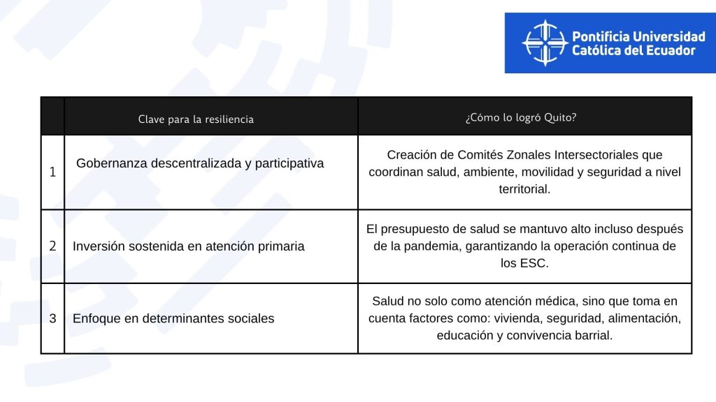 El estudio “Strengthening primary health care resilience through community innovation: a qualitative case study from Quito’s response to COVID-19”, documentó cómo la capital ecuatoriana pasó de un modelo reactivo y hospitalario a uno preventivo, comunitario e intersectorial, hoy considerado referente para América Latina.