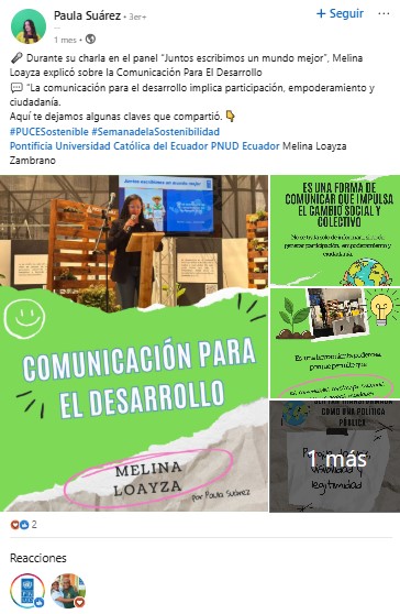 Los estudiantes de Comunicación y Creatividad Multiplataforma de la PUCE vivieron una experiencia práctica e inspiradora que los retó a comunicar con propósito. El evento Juntos escribimos un mundo mejor, desarrollado en la Semana de la Sostenibilidad, reunió a tres referentes en el tema: Ricardo Borja (Comciencia), Melina Loayza (PNUD) y María del Pilar Mora (LUPWI). Sus charlas no solo generaron reflexión, sino que impulsaron a los estudiantes a traducir las ideas en acción, creando publicaciones en redes sociales para amplificar el mensaje de un futuro más sostenible.